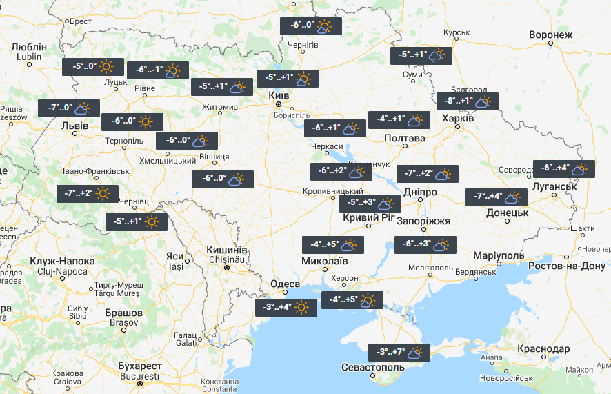 На Різдво, 7 січня, в Україну повернуться морози, проте день обіцяє бути сонячним і без опадів. Лише в Сумській області можливий сніг. У більшості областей очікується невелика хмарність, а стовпчики термометрів вдень покажуть від -1° до +5°.
