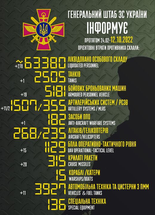 Загальні бойові втрати противника з 24 лютого до 12 жовтня орієнтовно сягнули (в дужках – за минулу добу):
