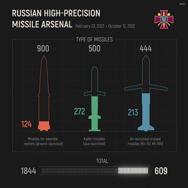 Станом на 12 жовтня у росії залишилося 609 високоточних ракет із 1 тисячі 844, які були на початку повномасштабного вторгнення.