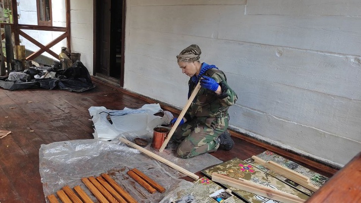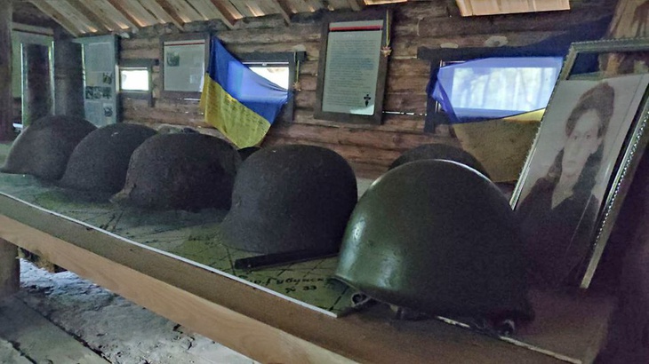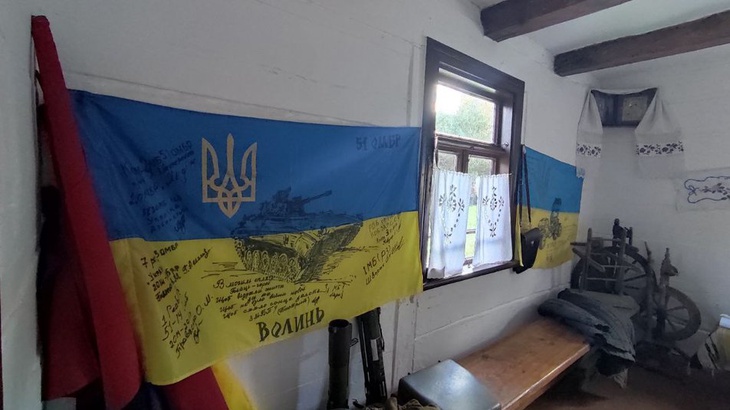 У другій хатині формують експозицію, присвячену волинській бригаді. Зі слів художниці-волонтерки Оксани Марченко, серед речей-трофеїв – бронежилети і каски російських військ. Формувати виставку допомагає син мисткині Тимофій.