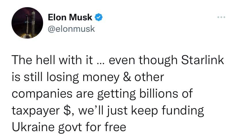 «Чорт з ним... попри те, що Starlink досі втрачає гроші, а інші компанії отримують мільярди доларів платників податків, ми просто будемо продовжувати безкоштовно фінансувати уряд України», – заявив він.