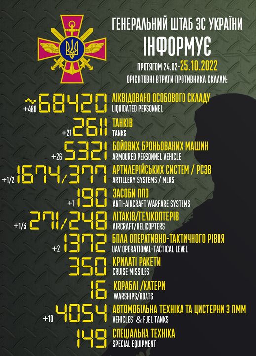Загальні бойові втрати противника з 24 лютого до 26 жовтня орієнтовно сягнули (в дужках – за минулу добу):