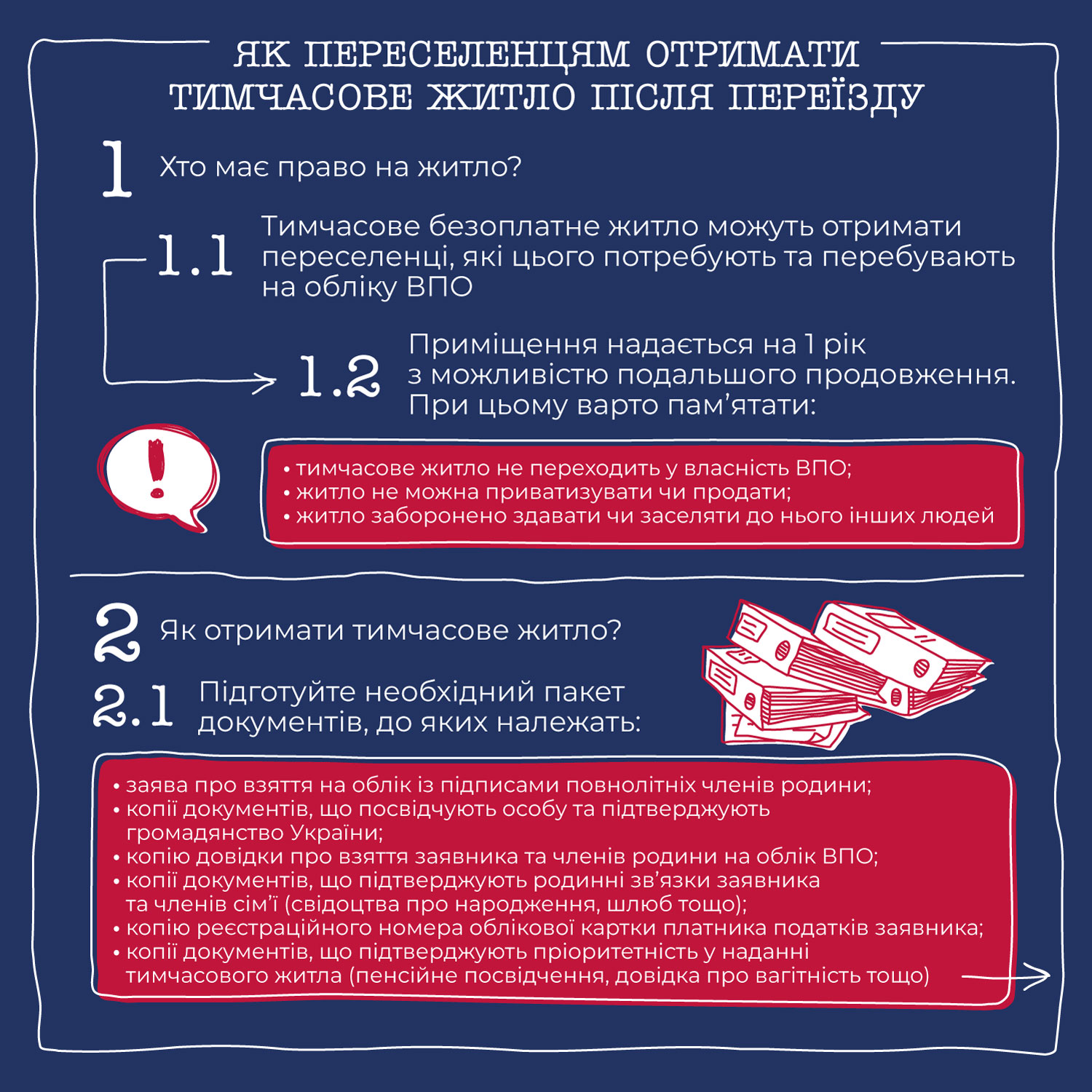 Опинившись у новому місті переселенці можуть звернутися до прихистків чи зупинитися у знайомих. Однак, як правило, це короткострокові варіанти. У новій інфографіці коротко і зрозуміло розповідаємо, як отримати безоплатне житло на рік із можливістю подальшого продовження.
