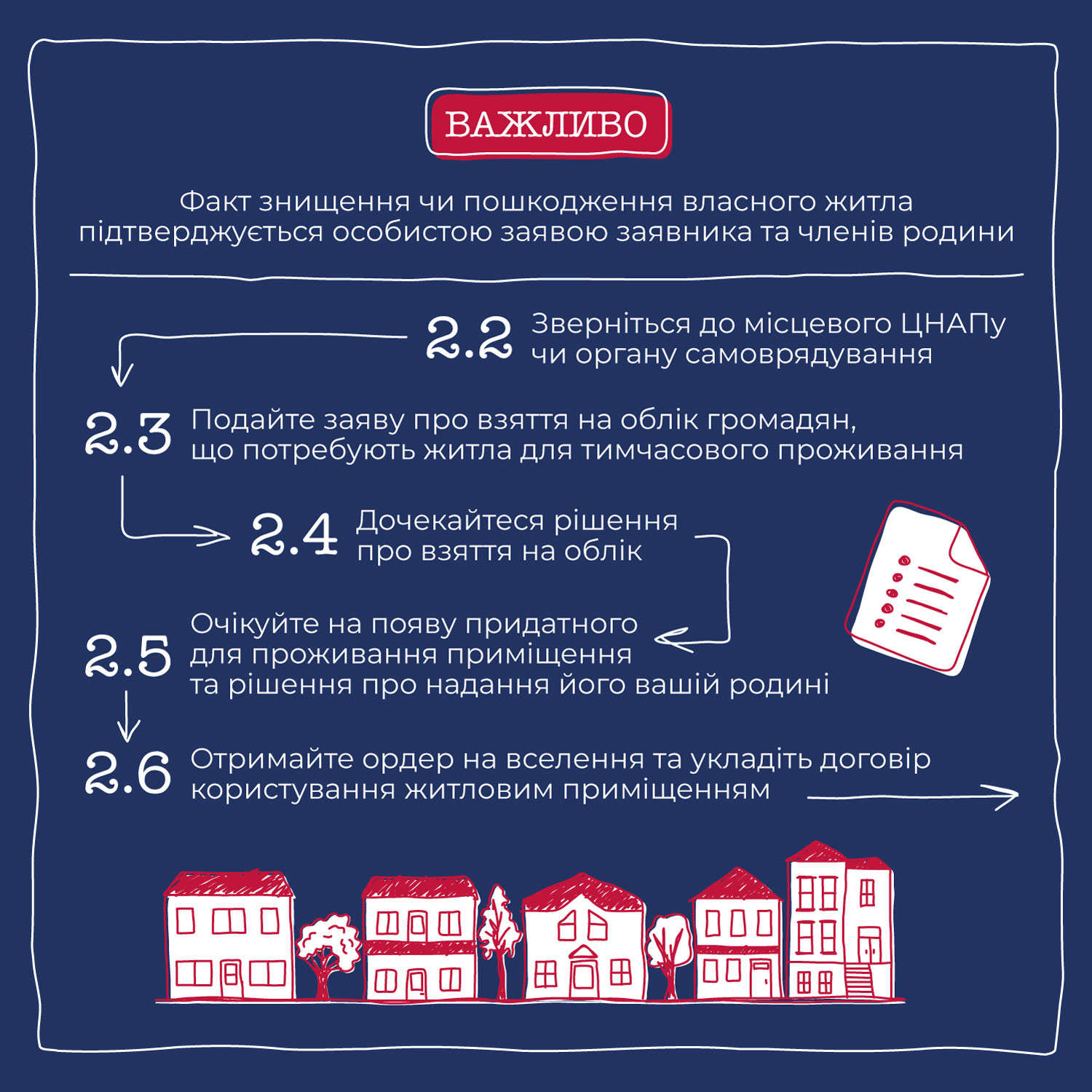 У межах проєкту «Громада Діє» команда ШоТам створила серію графічних інструкцій з порадами для громад та внутрішньо переміщених українців. Ми розповідаємо про відбудову громади, релокацію бізнесу, залучення донорського фінансування, підготовку до опалювального сезону. А цього разу підготували покрокову інструкцію, яка допоможе переселенцям вирішити питання з житлом.
