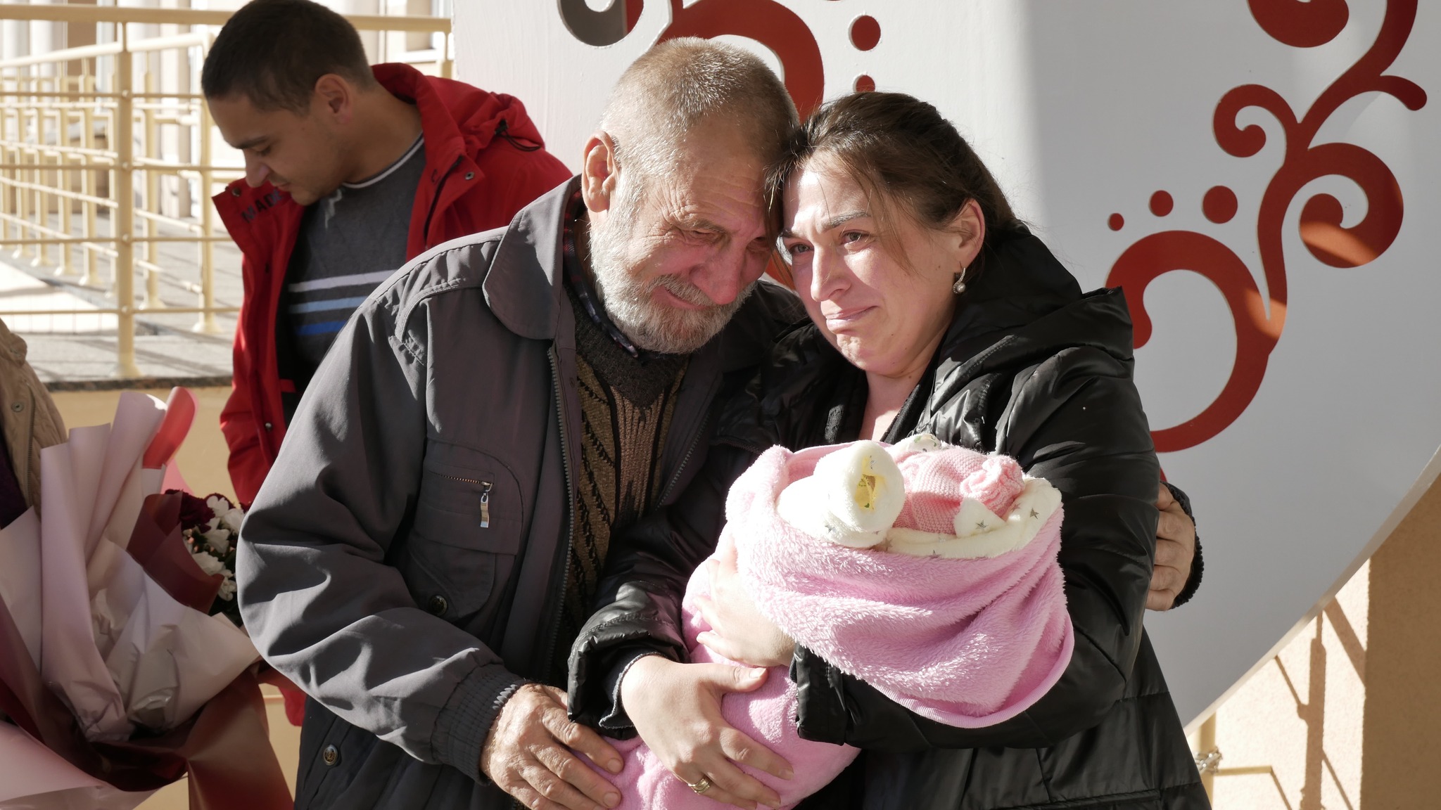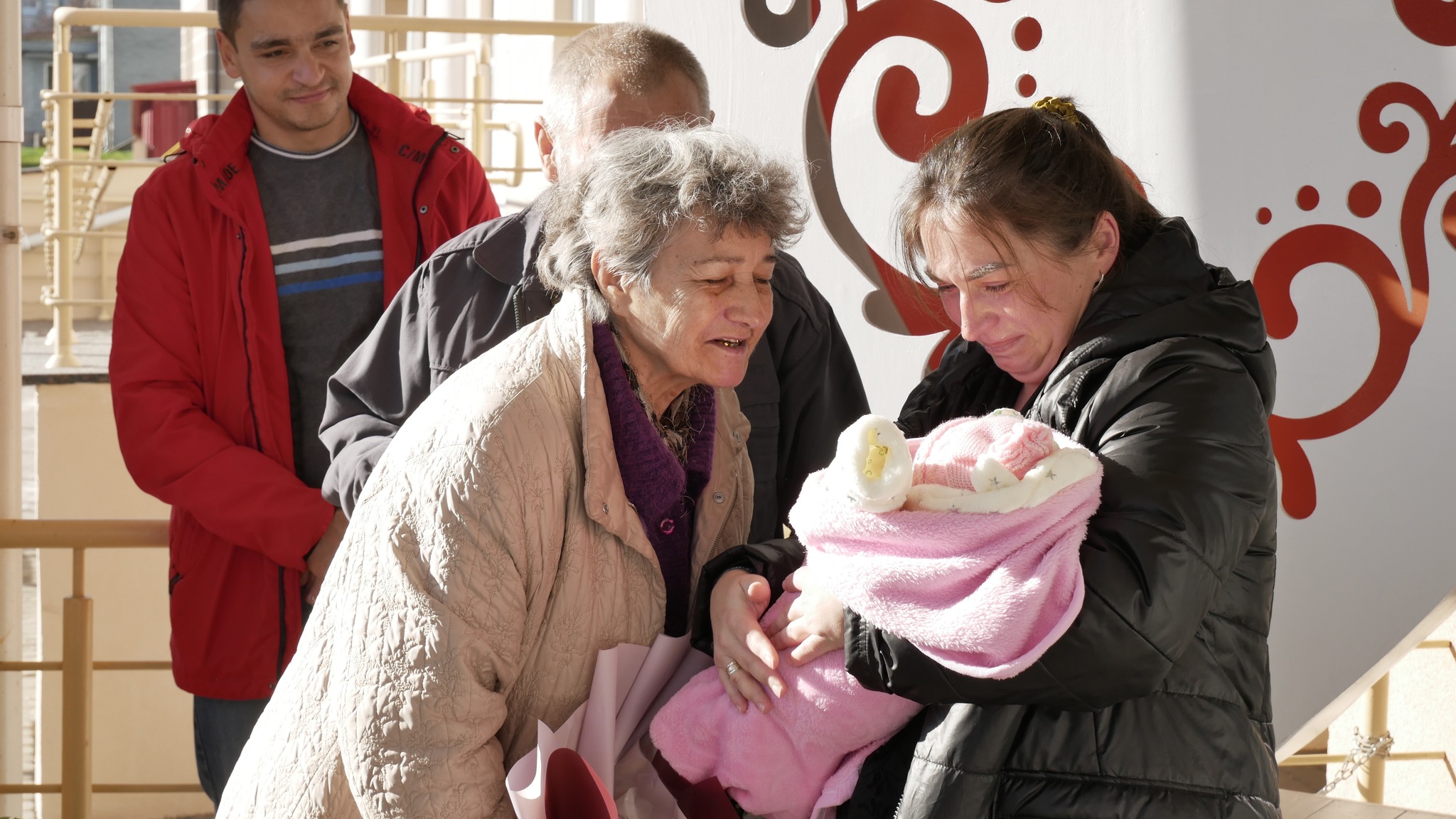 Зустрічати молоду породіллю прийшли найближчі родичі на друзі.