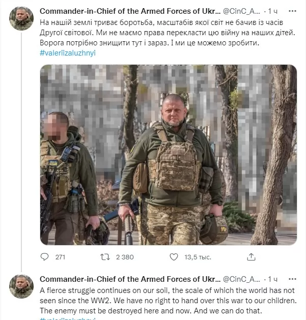 «На нашій землі триває боротьба, масштабів якої світ не бачив із часів Другої світової. Ми не маємо права перекласти цю війну на наших дітей. Ворога потрібно знищити тут і зараз. І ми це можемо зробити», - наголосив Залужний.