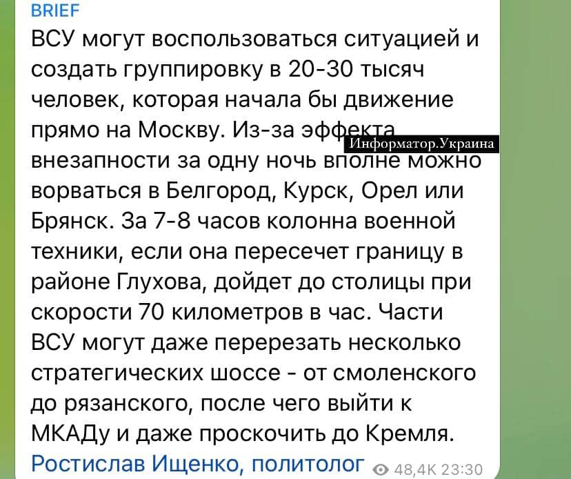 «Якщо наші (російські – Ред.) війська остаточно підуть на лівий берег Херсонського плацдарму, вони займатимуть невелику дугу від Каховського водосховища до стику кордонів Луганської, Харківської областей РФ», – сказав Іщенко. За такого стану справ, вважає пропагандист, ЗСУ можуть скористатися ситуацією та створити угруповання «у 20-30 тисяч осіб, яке почало б рух прямо на Москву». На думку Іщенка, через ефект раптовості за одну ніч цілком можна увірватися в Бєлгород, Курськ, Орел або Брянськ. «За 7-8 годин колона військової техніки, якщо вона перетне кордон у районі Глухова, дійде до столиці за швидкості 70 кілометрів на годину», – такий прогноз дає політолог.