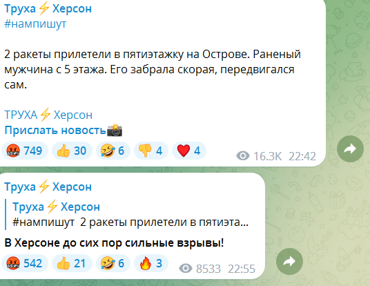 Місцеві пабліки повідомляють, що дві ракети влучили в багатоповерхівку на Острові (острів у пониззі Дніпра, входить до складу земель Херсонської міської ради).