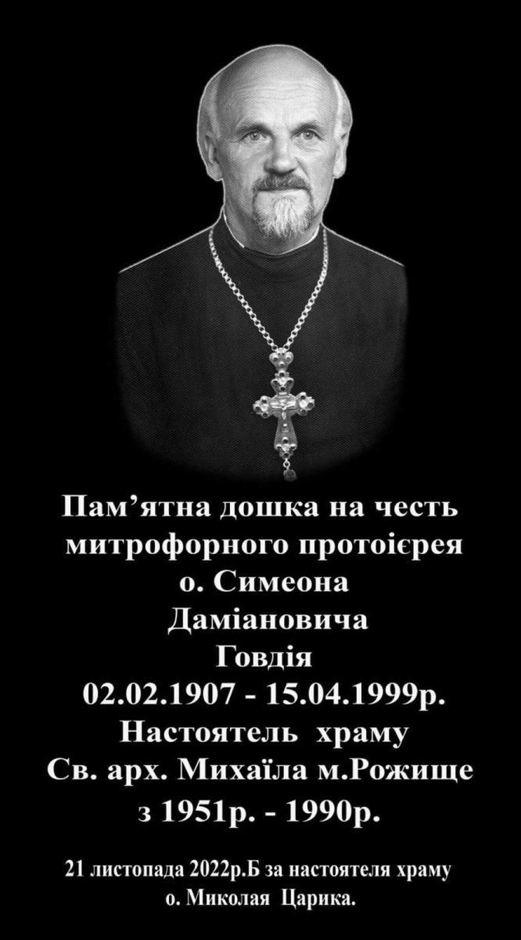 Честь і хвала патріоту Симеону Говдію, який залишив після себе глибокий слід. Вдячні рожищани добилися, щоб Свято-Михайлівський храм став нарешті українським. І це сталося влітку 2022 року після двохмісячної боротьби з УПЦ МП. 21 листопада на храмі відкриють меморіальну дошку Симеону Говдію.