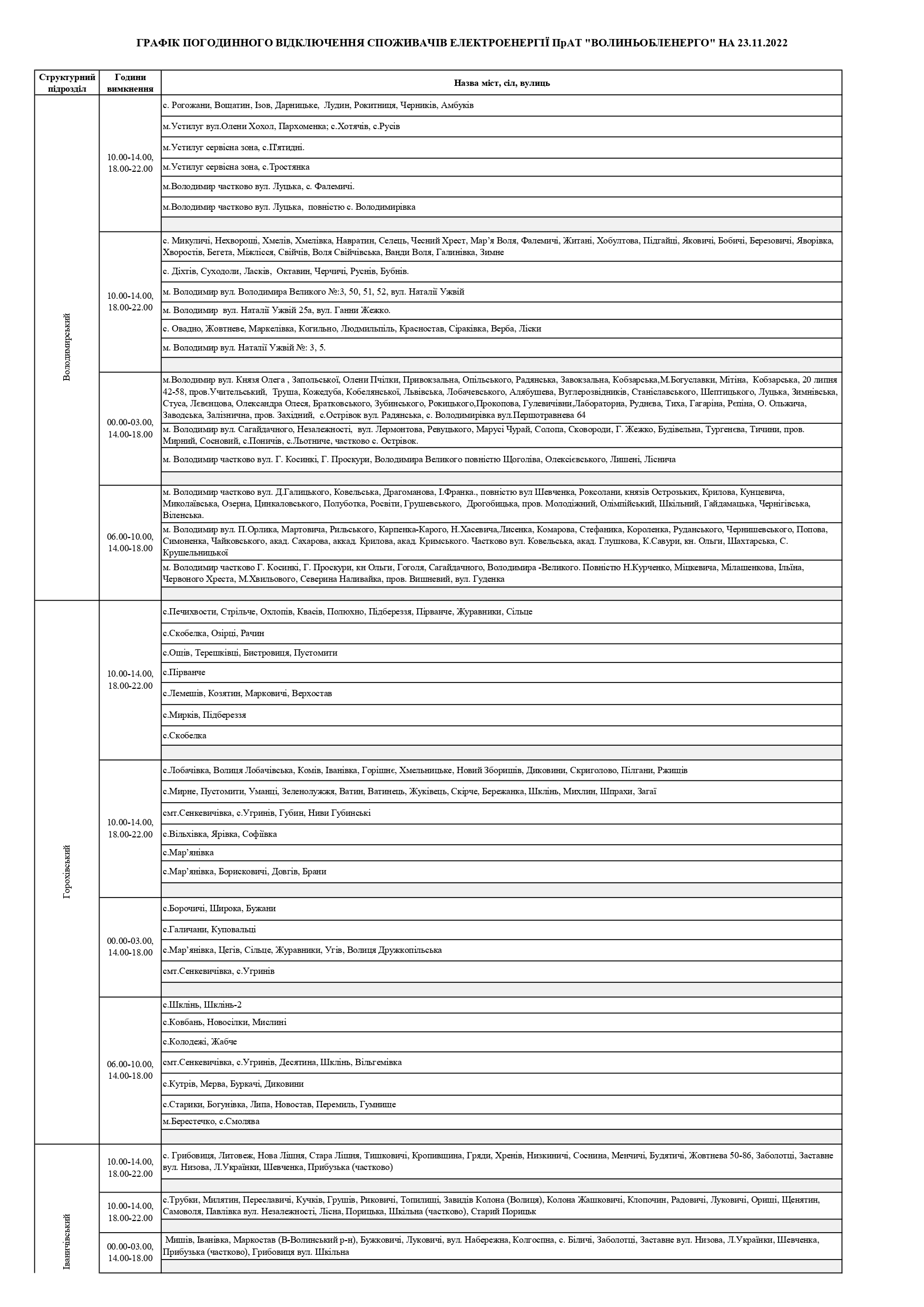 У середу, 23 листопала, відбудуться погодинні відключення електроенергії на Волині.