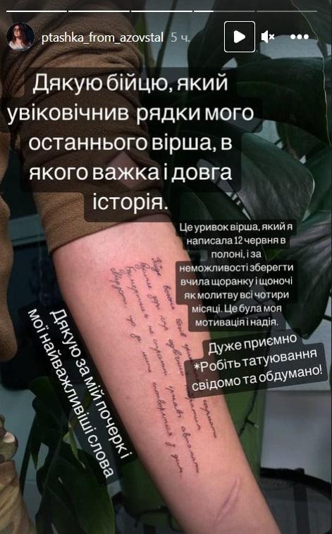 «Дякую бійцю, який увіковічнив рядки мого останнього вірша, в якого важка і довга історія. Це уривок вірша, який я написала 12 червня у полоні, і, за неможливості зберегти, вчила щоранку і щоночі, як молитву, всі чотири місяці. Це була моя мотивація і надія», - написала Поліщук.