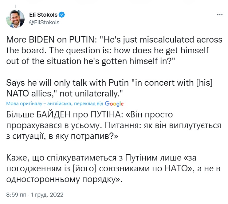 Про це повідомляє журналіст Politico Елі Стоколс у Twitter.