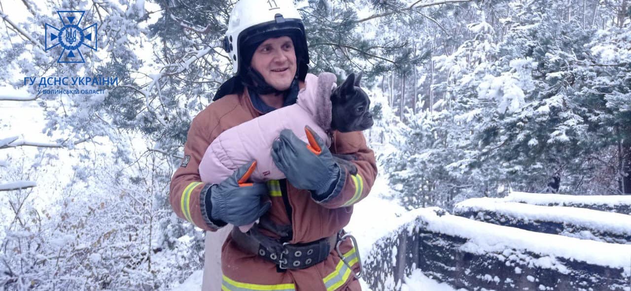 Собака не травмувалась, під час рятувальної операції на руках у вогнеборця вела себе чемно.
