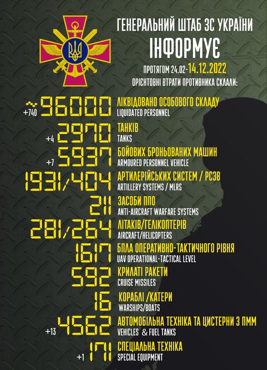 Загальні бойові втрати противника з 24 лютого до 14 грудня орієнтовно сягнули (в дужках – за минулу добу):