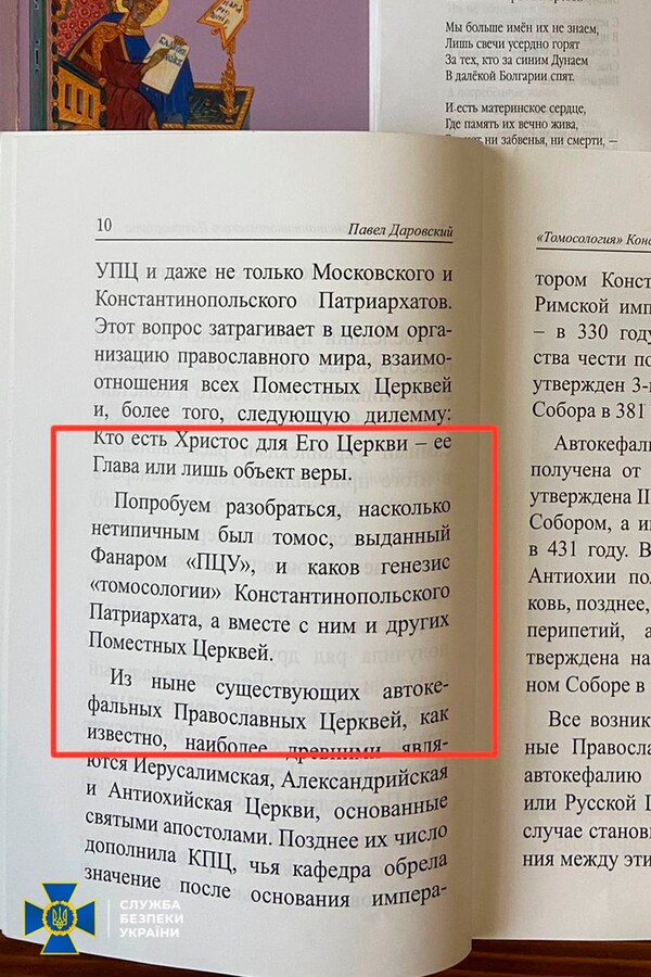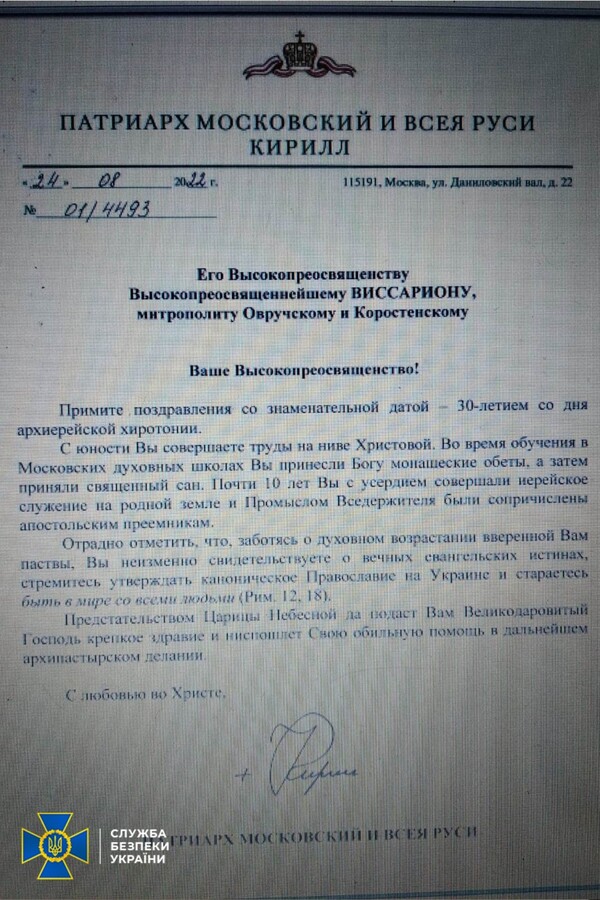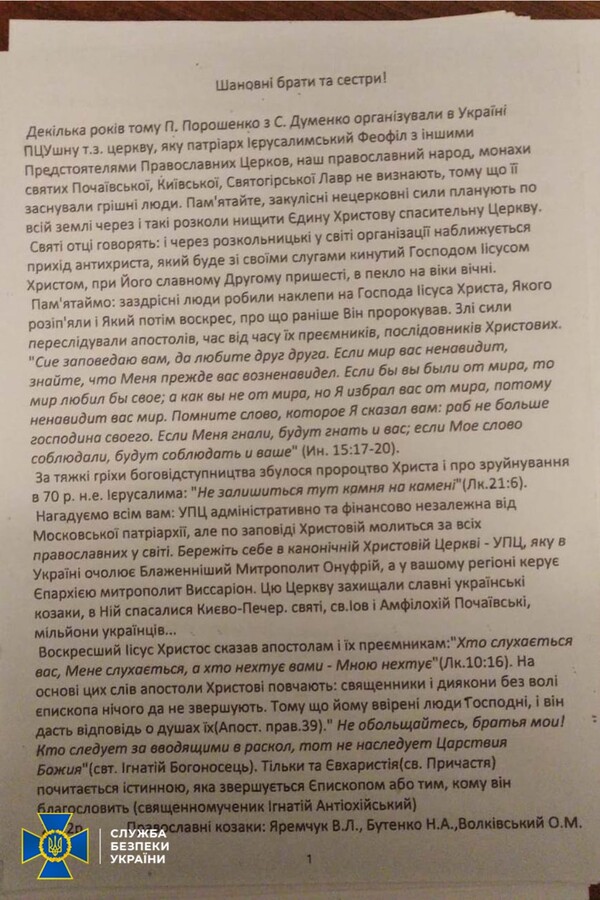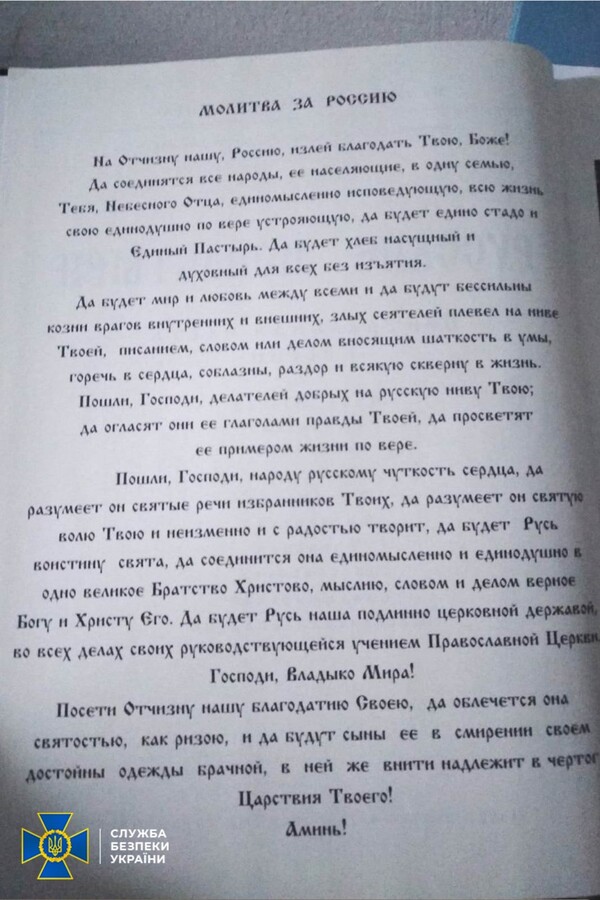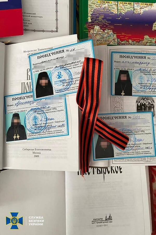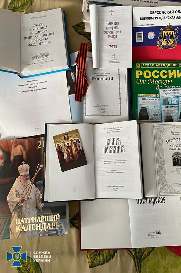 На території єпархій знайдено російські паспорти, георгіївські стрічки, символіку забороненої партії ОПЗЖ і «методички» Кирила щодо поширення ворожої пропаганди через вірян. Крім цього, виявлено склади з прокремлівською літературою, у тому числі авторства ідеолога рашизму Івана Ільїна. У цих виданнях представники РФ заперечують існування українського народу, його мови і культури, а також ставлять під сумнів українську державність.