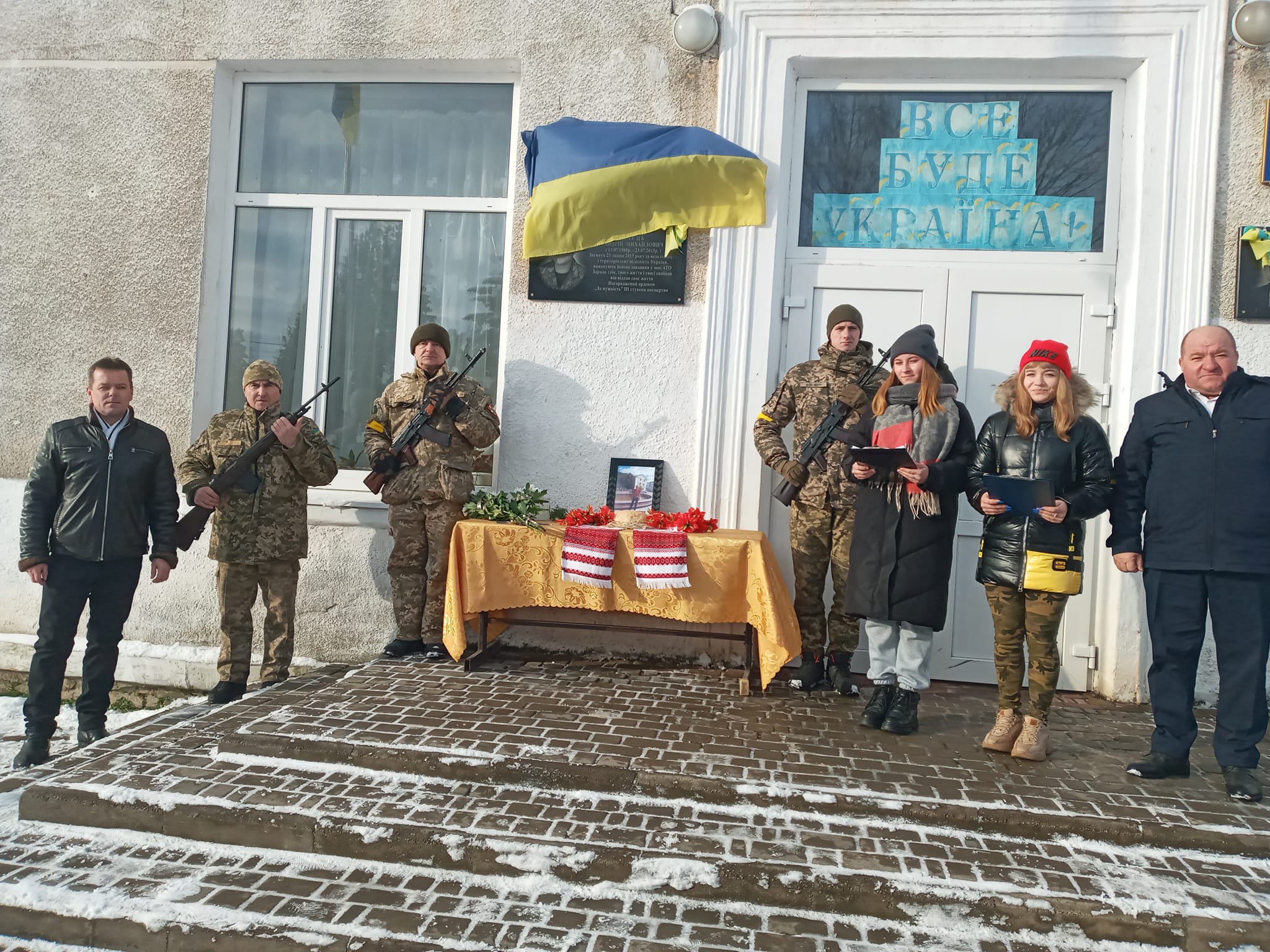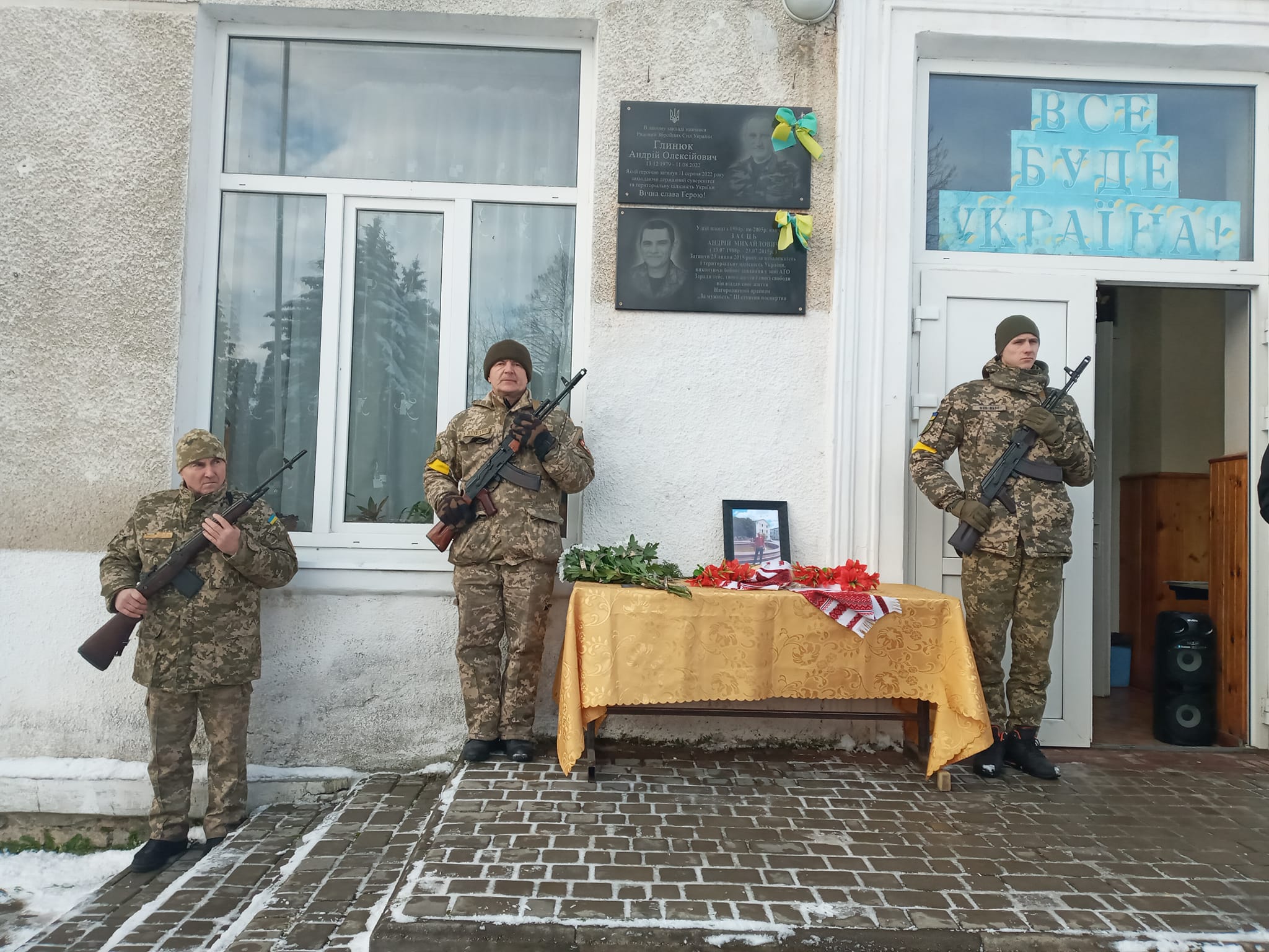 Відкрив пам'ятний знак брат Андрія Глинюка, а освятив дошку отець Анатолій. Відомо, що військовий народився 13 грудня 1979 року в селі Кияж. Йому виповнилося б 43 роки.