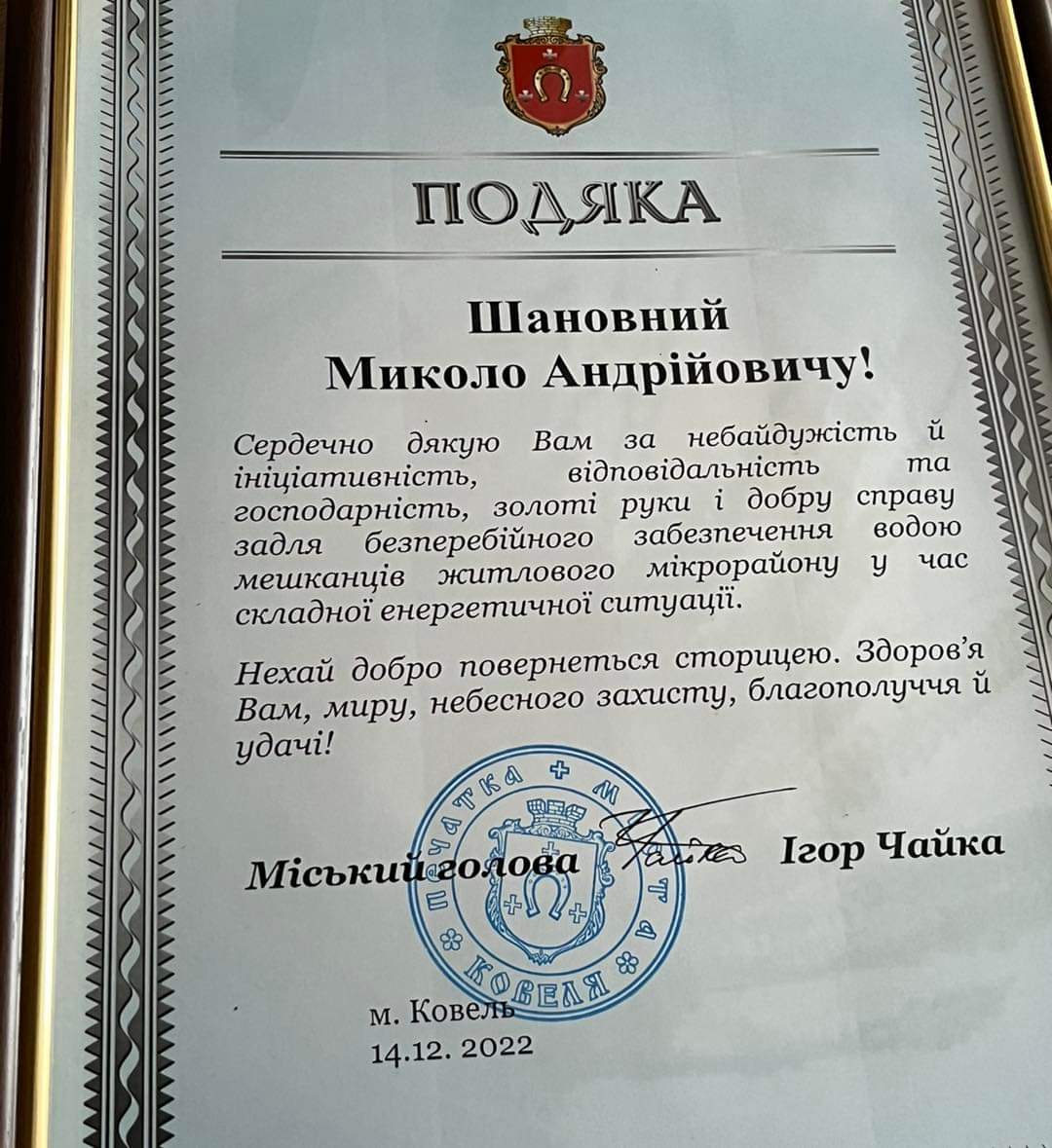 Пам‘ятаєте історію про водонапірну колонку на Незалежності, яку нібито невідомі зняли, а після розголосу повернули на місце?З ’ясувалося, що колонку тоді зняв, щоб відігріти і полагодити, давній її опікун та майстер на всі руки Микола Андрійович Вакарчук. Він - місцевий пенсіонер, який з моменту проживання в одному з будинків поряд, постійно стежив за тим, щоб вона завжди була справною, і щоб мешканці з довколишніх будинків могли без проблем набрати з неї воду, - написав Чайка.