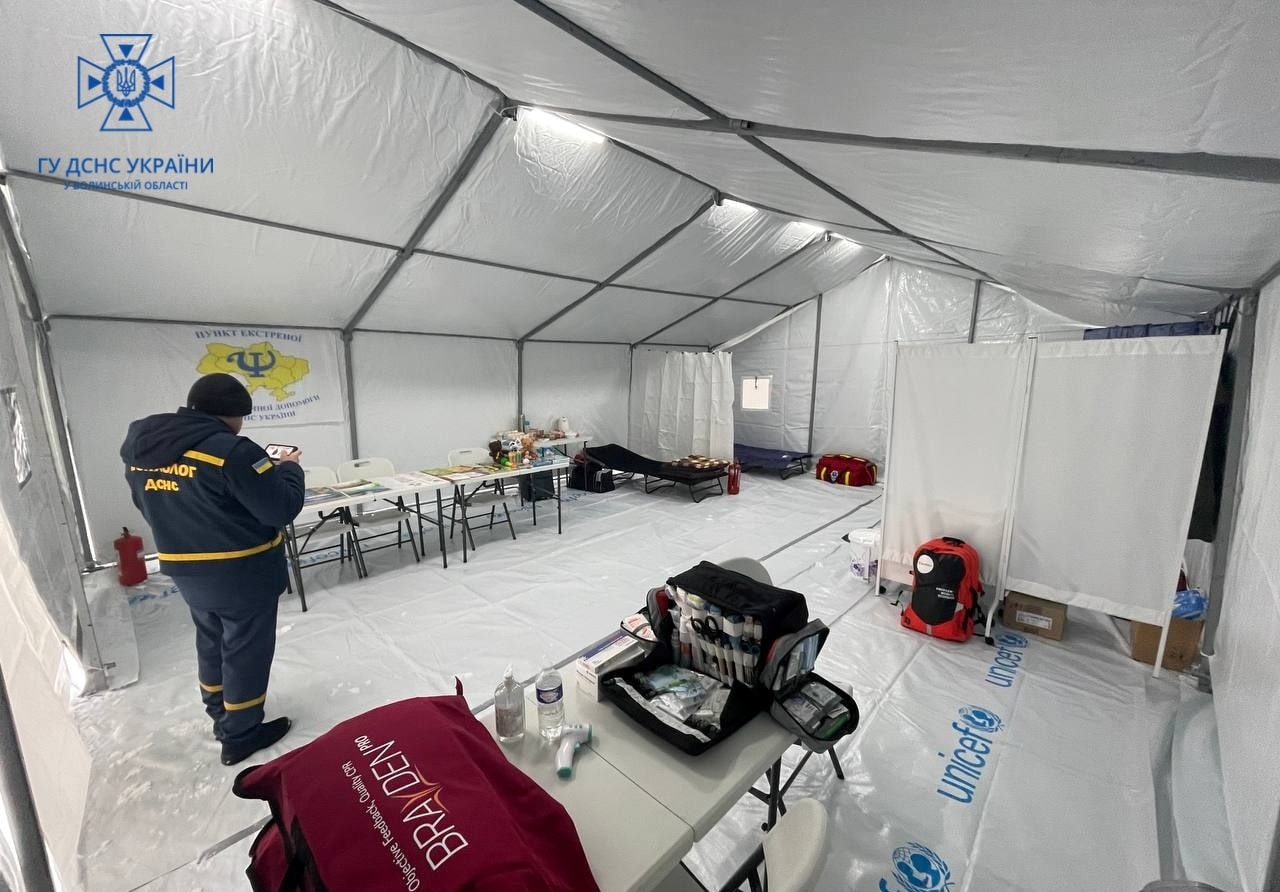 Зазначається, що рятувальники ДСНС розгорнули наметове містечко. До його складу входять місце роботи міжвідомчого штабу, пункти надання консультативної медичної та психологічної допомоги, пункт відпочинку та обігріву, намет для прийому їжі, гарячих напоїв та питної води.