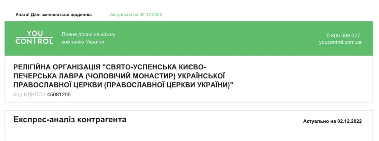 «1 грудня 2022 р. було зареєстровано статут Свято-Успенської Києво-Печерської Лаври (чоловічого монастиря) Української Православної церкви (Православної церкви України). Відомості про цю юридичну особу в складі Помісної церкви внесені 2 грудня до Єдиного державного реєстру», - йдеться у повідомленні.