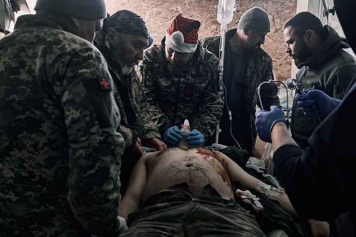 “Санта” схиляється над пораненим. Цікаво, чи бачить він свого рятівника в кумедній шапочці, чи запам‘ятає, хто його рятував?