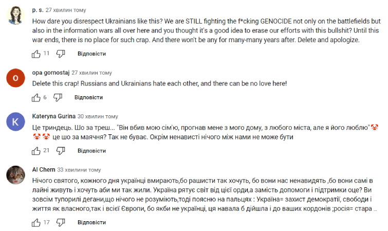 «Вони вбивають і катують нас, вони забирають наші домівки, а ти перетворюєш наші страждання у свій маленький романтичний фільм? Як квір-українка, я приголомшена. Ми НІКОЛИ не пробачимо того, що з нами зробили росіяни.
