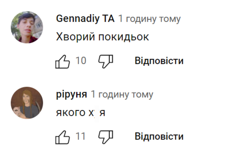 «Росіяни ґвалтують дітей, жінок і чоловіків, вбивають і катують їх, руйнують їхні будинки, а у тебе вистачає нахабства публікувати це сміття. Зараз я не здивуюся, якби ти зняв фільм про дитину та педофіла.