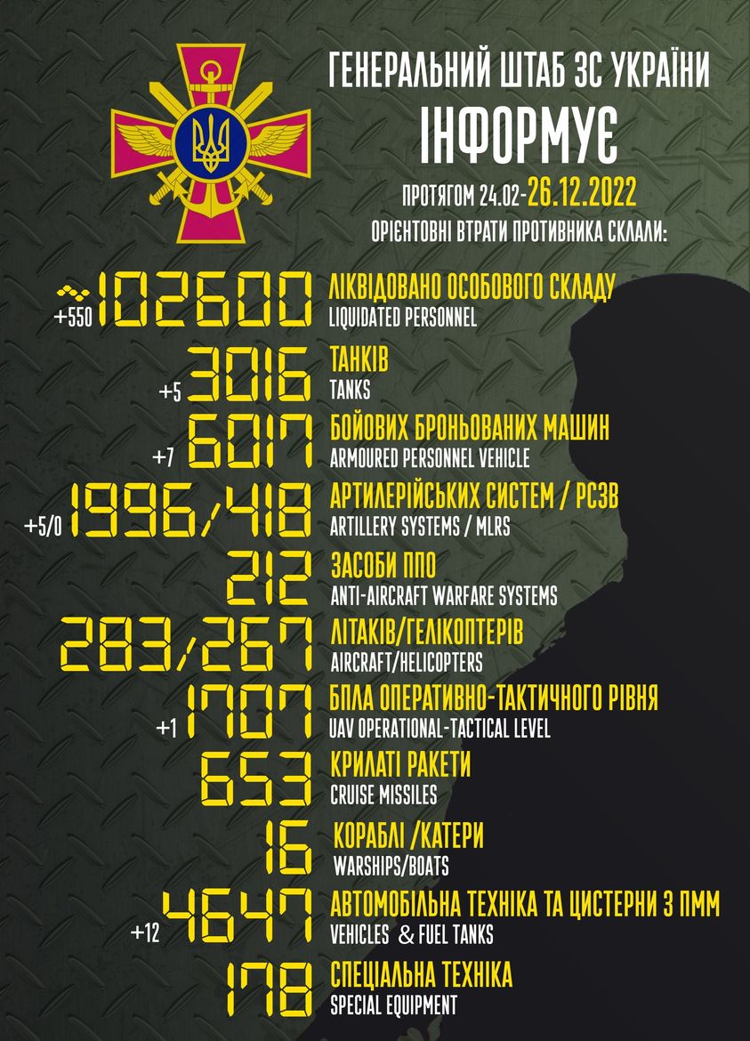 Загальні бойові втрати противника з 24 лютого до 26 грудня орієнтовно сягнули (в дужках – за минулу добу):