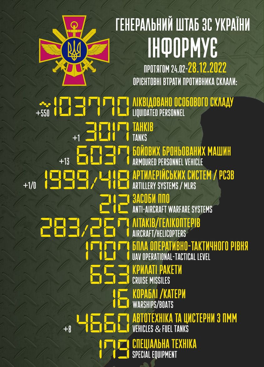 Загальні бойові втрати противника з 24 лютого до 28 грудня орієнтовно сягнули (в дужках – за минулу добу):