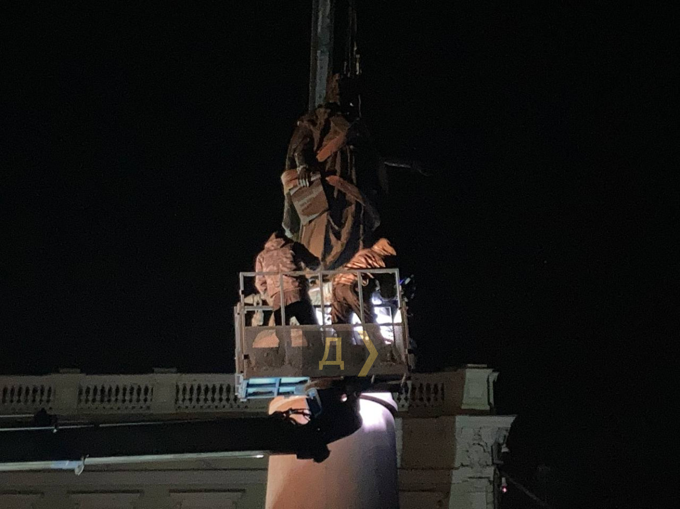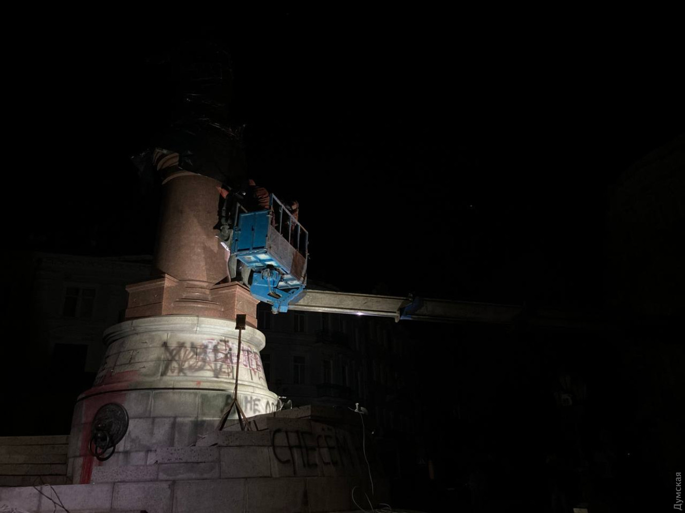 Увесь день комунальники проводили підготовяі роботи, розбирали дерев'яний саркофаг, що приховував Катерину II, а ближче до півночі почали демонтаж.