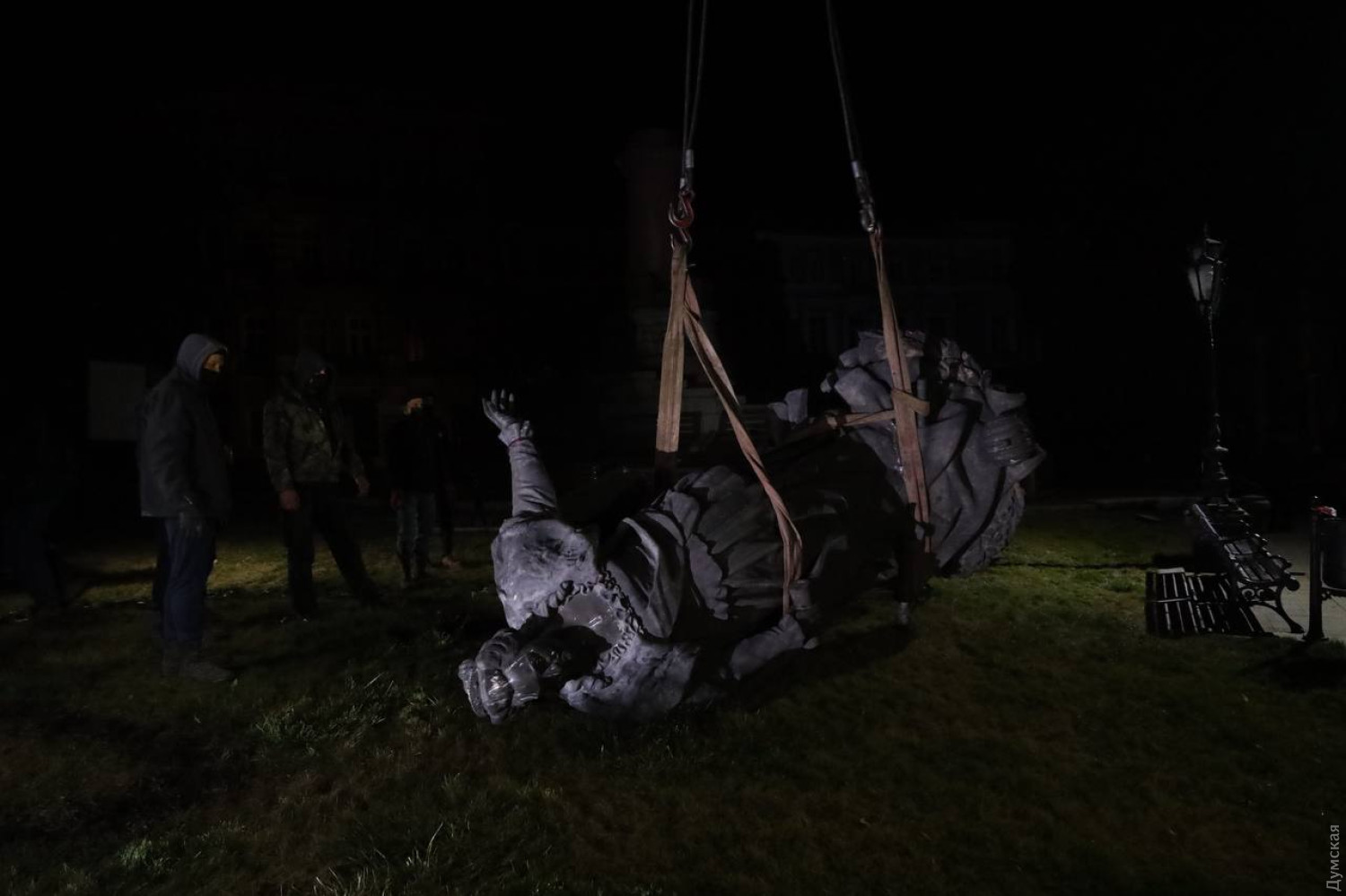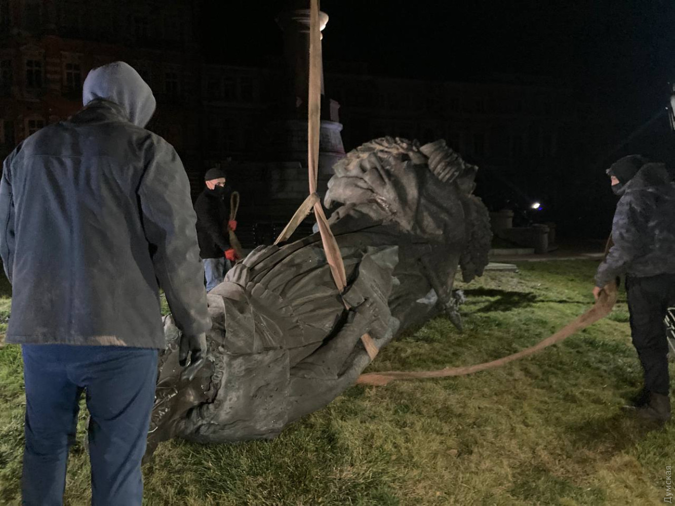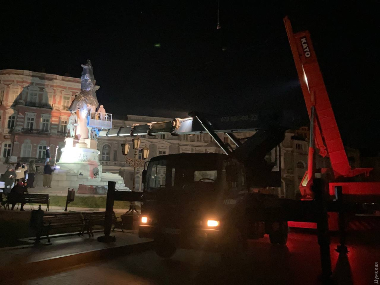 Із постаменту зняли табличку. Також робітники піднялися на автовишці і демонтували скульптури двох фаворитів Катерини з постаменту пам'ятника російської імператриці. Згодом поклали на кузов вантажівки і саму Катерину. Пам'ятник повезли до Одеського обласного художнього музею.