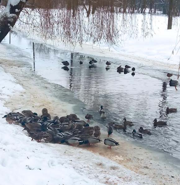 «Здається, качки і не збираються звідси нікуди переселятися. Поки плесо не замерзло, птахи плавають, пірнають, чалапають по засніжених берегах, ніби кожен виконує своє завдання. Досить цікаво за ними спостерігати. Перехожі часто милуються таким господарюванням крижнів на річці. Ми живемо поряд і підсипаємо птахам зерна. Згодували вже більше, ніж мішок», - розповідає Валентина Приходько, зауважуючи, що шкода птахів, бо навряд чи такій кількості вистачає тих харчів, що вони можуть роздобути у невеликій річці.