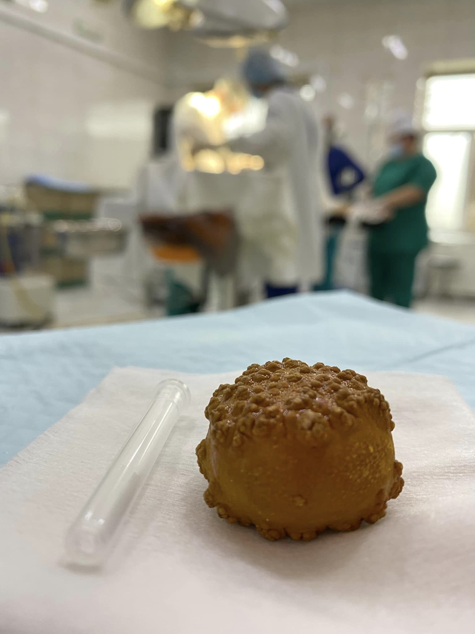 «Пацієнт звернувся зі скаргами на болі внизу живота, почащений сечопуск. Під час УЗД-дослідження встановлено діагноз: гіперплазія простати. Камінь сечового міхура з розмірами 50×30 мм. Шляхом оперативного втручання камінь видалено та чоловік повернеться до звичного способу життя», – йдеться у повідомленні.