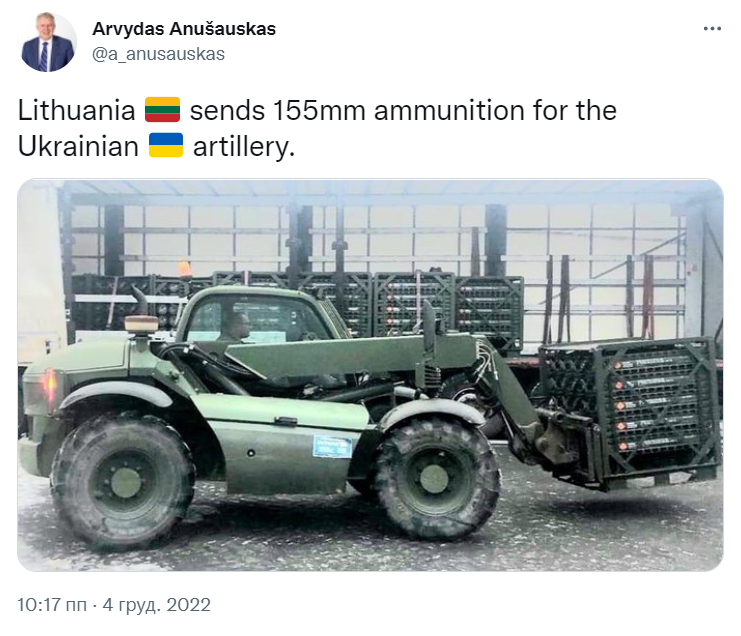 «Литва відправляє 155-мм боєприпаси для української артилерії», – коротко написав міністр оборони Литви.