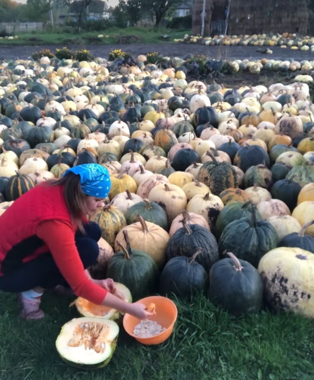 Господиня зізнається, що його у неї багато, адже і гарбузів садили немало — 30 соток. Вибирає поступово, гарбуз — корові на корм, а насіння — на продаж і оптом, і вроздріб. До речі, продає через мережу гарбузові диньки значно дорожче, ніж купують на опті. Тож для зацікавлення аудиторії придумала пакування зі своїм логотипом — «Олеся з Волині». Каже, зазначення регіону сьогодні відіграє свою роль. А тим паче, коли продукт передають за кордон.