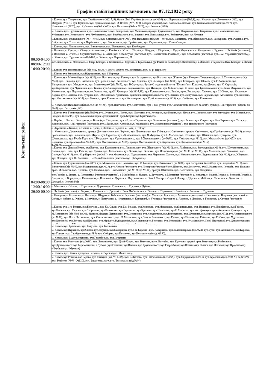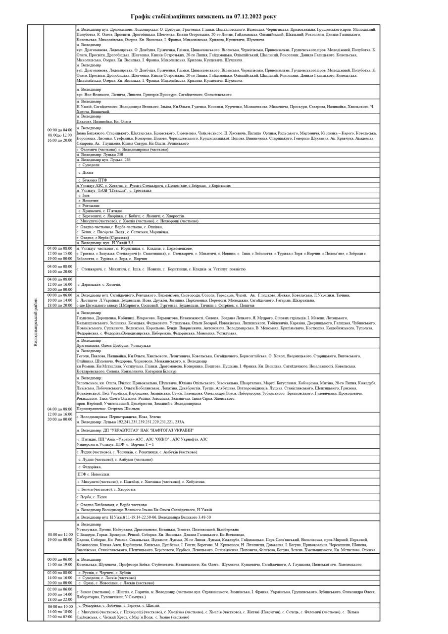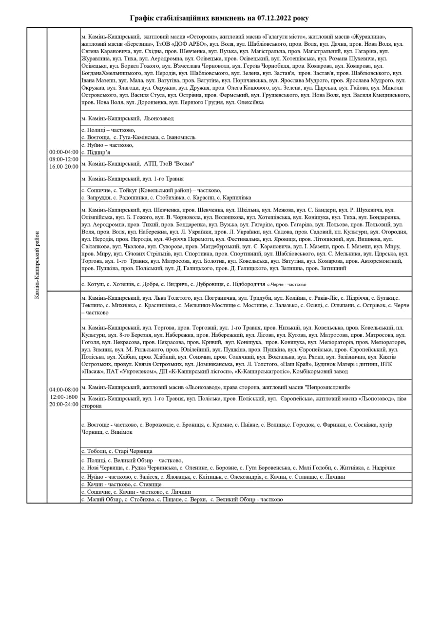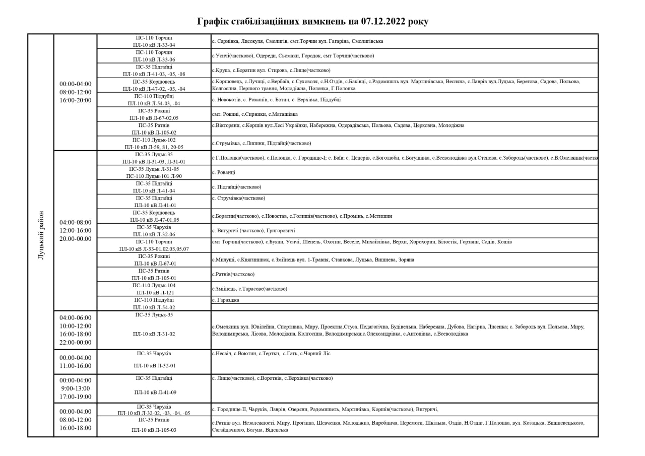 ПрАТ «Волиньобленерго» у відповідності до доведених величин споживання розроблено графіки стабілізаційних вимкнень по районам обслуговування філій Товариства.
