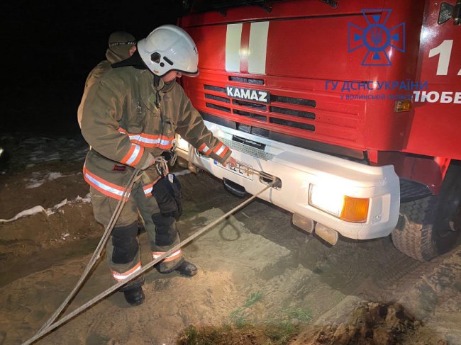 Автомобіль служби 103 через складні погодні умови не зміг проїхати ґрунтовою дорогою Любешів-Лахвичі, отож рятувальники відбуксирувати транспортний засіб пожежною автоцистерною.