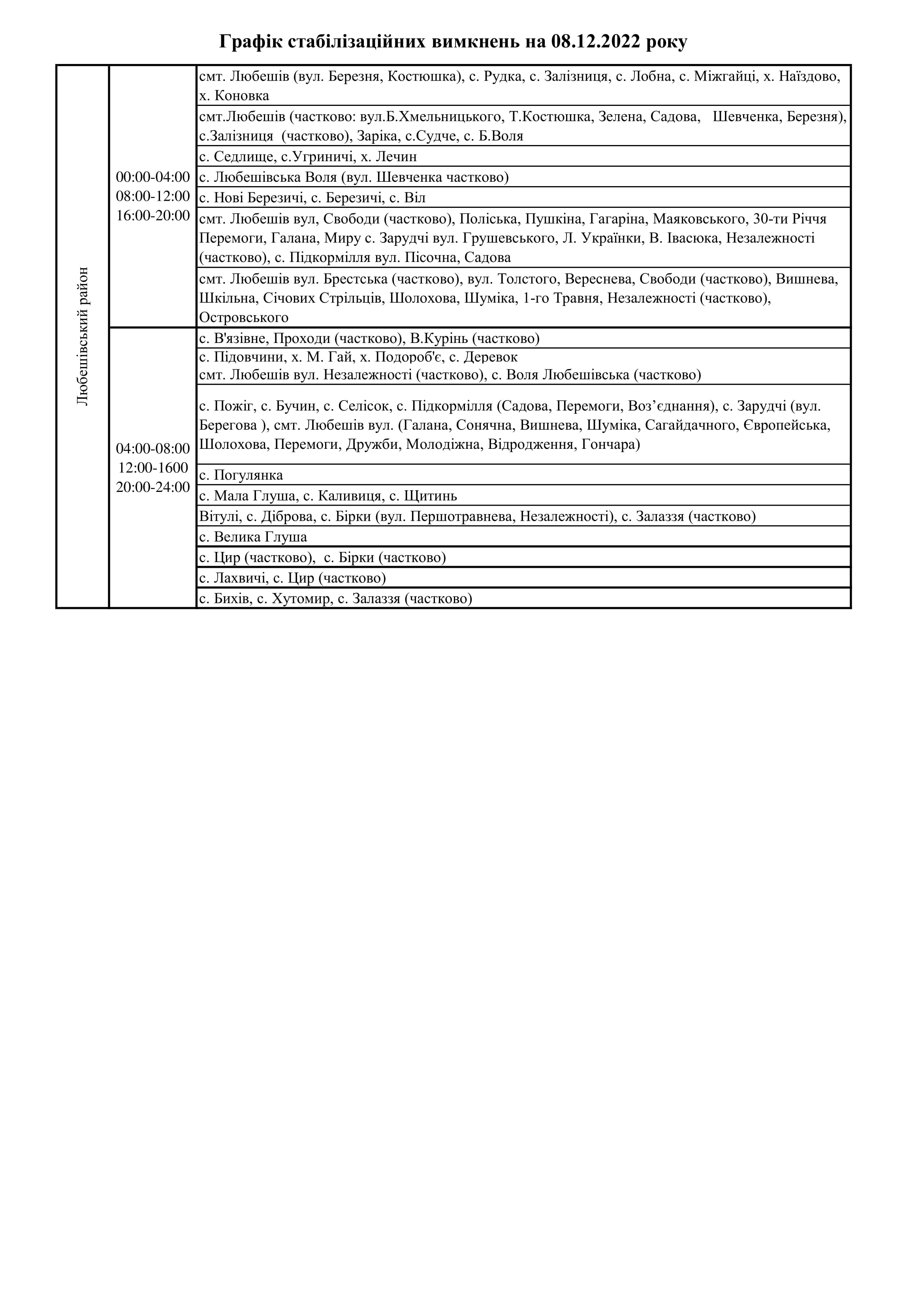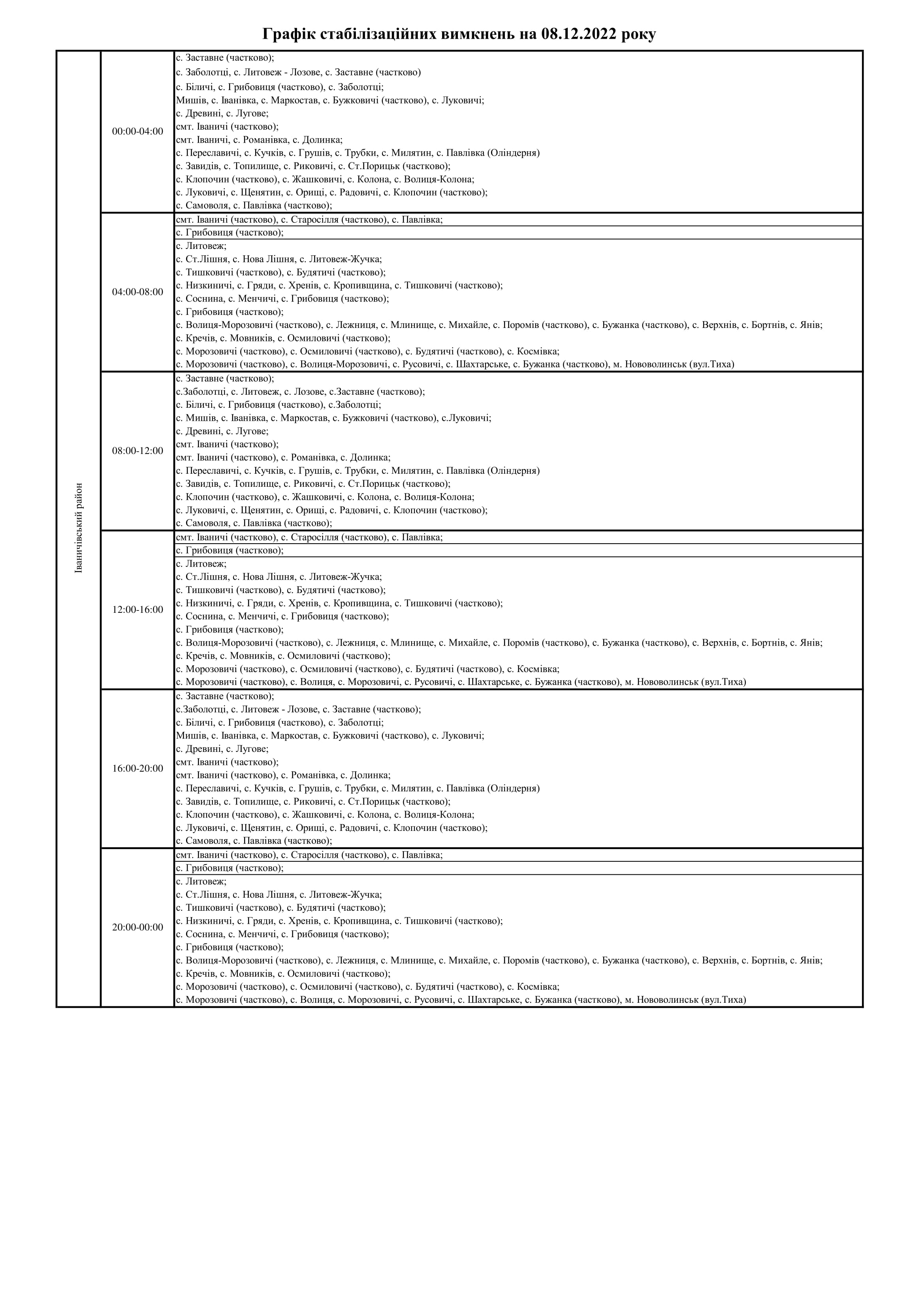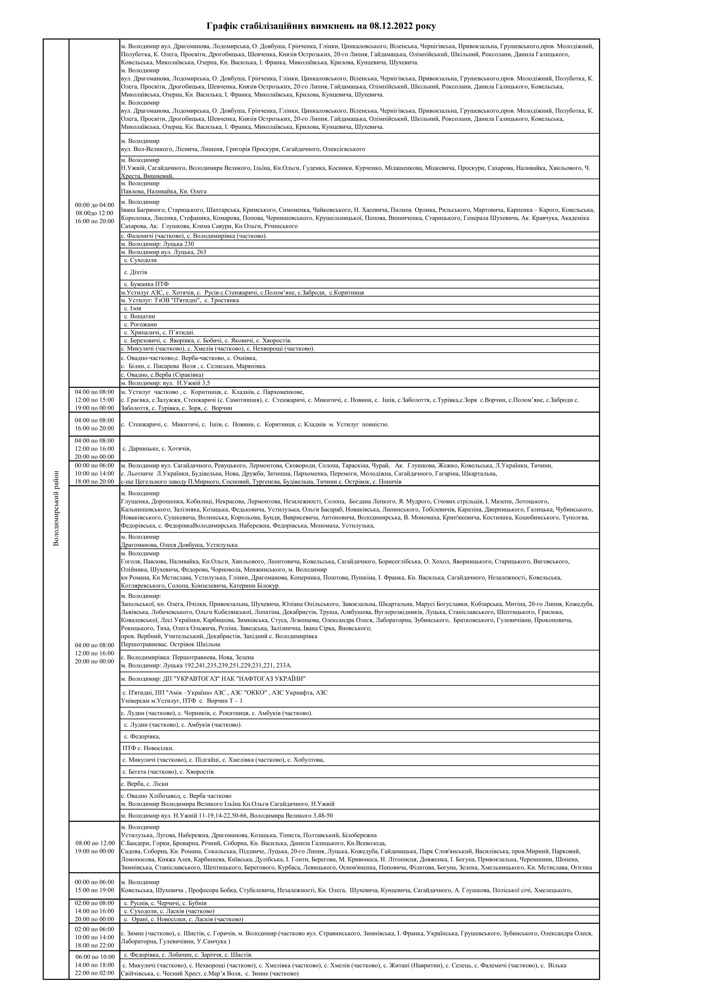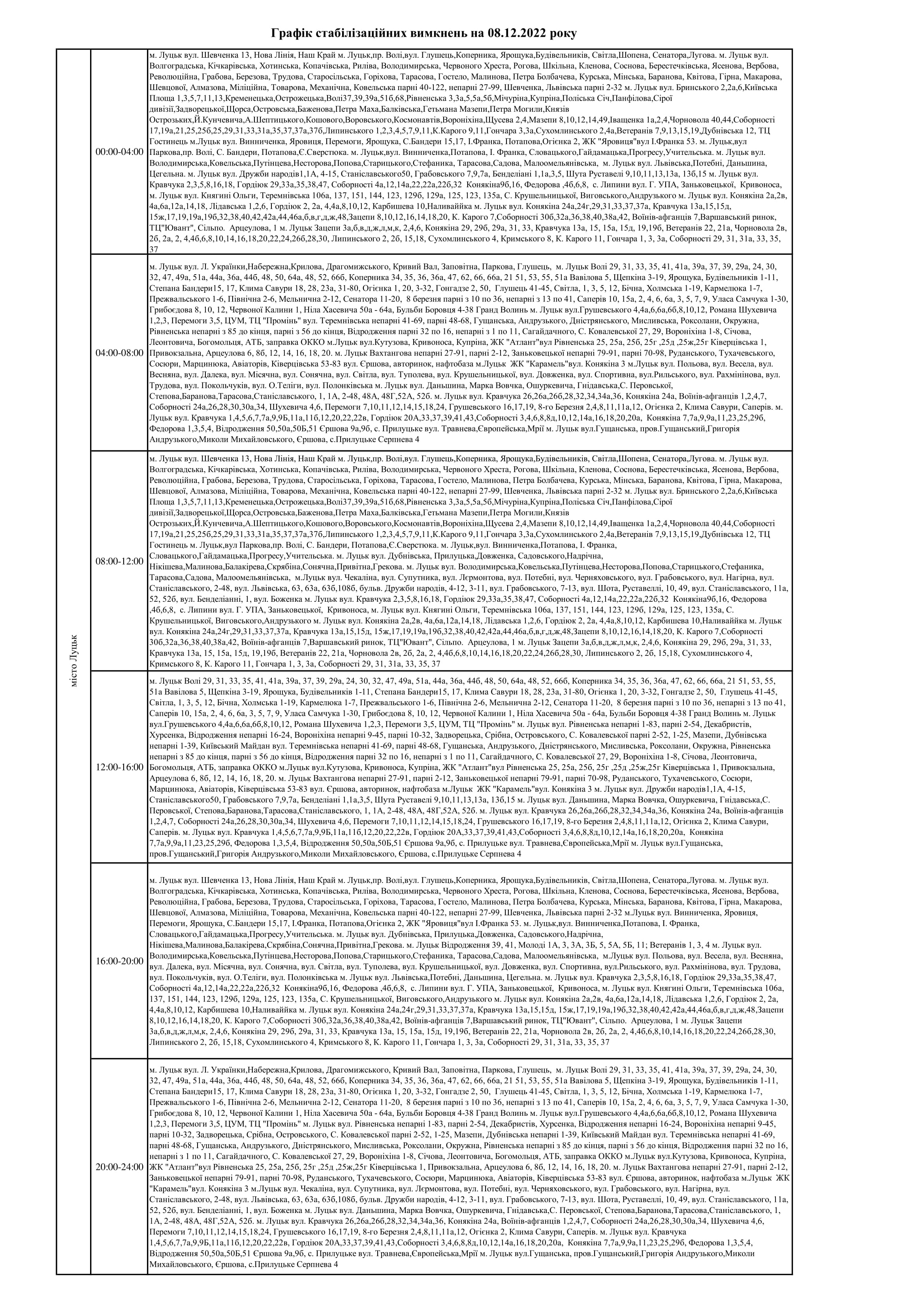 ПрАТ «Волиньобленерго» у відповідності до доведених величин споживання розроблено графіки стабілізаційних вимкнень по районам обслуговування філій Товариства.