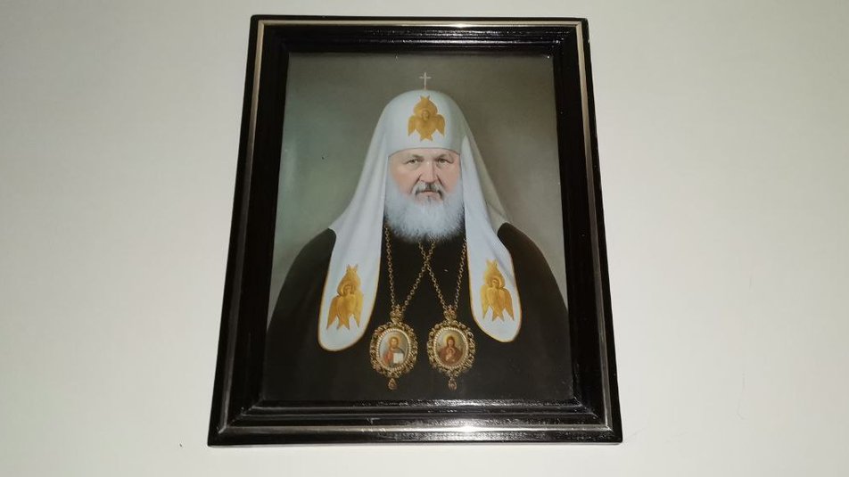 Архімандрит Леонтій говорить: до монахів СБУ під час перевірки ставилися толерантно. У його особистому кабінеті над входом — портрет росіянина Кіріла (Гундеєва).