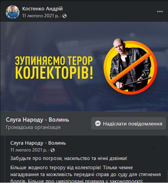 До слова, вочевидь, тема колекторів болюча для політика. Адже 11 лютого 2021 року він у себе на сторінці розмістив допис від волинської партійної організації «Слуга народу» – «Зупиняємо терор колекторів», у якому йшлося про законопроєкт, яким пропонується обмежити арсенал вибивання боргів лише «чемним нагадуванням» та передачею справ до суду.