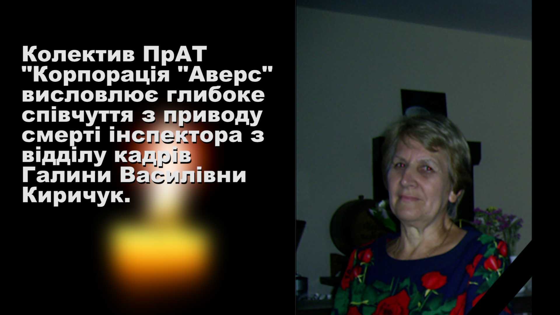 Колектив ПрАТ "Корпорація "Аверс" висловлює глибоке співчуття з приводу передчасної смерті інспектора з відділу кадрів Галини Василівни Киричук.