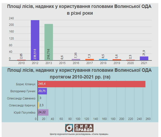 Із 2010 року найбільші площі лісів розпорядженням голів Волинської облдержадміністрації роздали у 2012-2013 роках – 238,5 і 213,5 гектара відповідно. Тоді Волинь очолював нині покійний Борис Клімчук. 2021-й отримав «бронзу» за сумарною площею лісів наданих у користування розпорядженням голови ОДА. Минулоріч таким чином приватним особам і фірмам виділили 24,2 гектара.