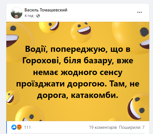 На сьогодні ситуація лише погіршилися. У п’ятницю, 4 лютого, Василь Томашевський написав у фейсбук-групі «Підслухано Горохів», що сенсу проїжджати цією дорогою вже немає. Автор назвав цей відрізок катакомбами.
