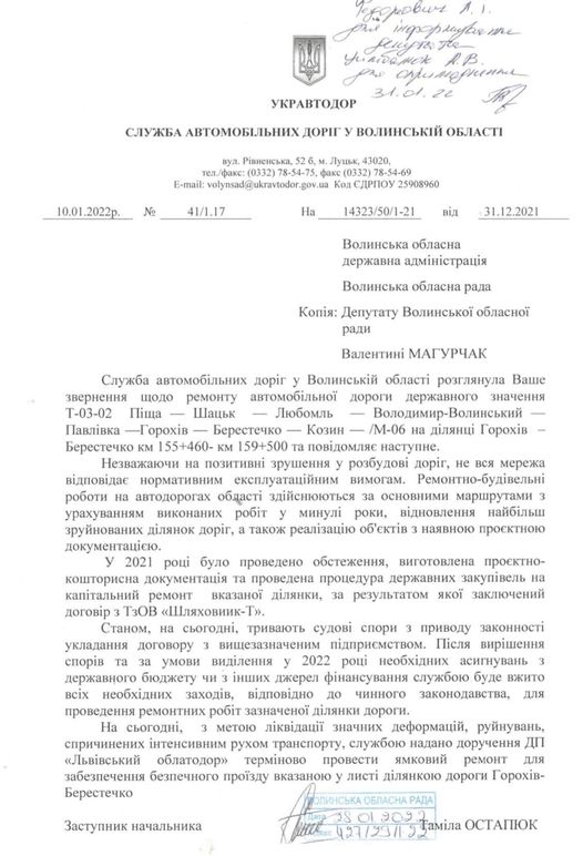 «На сьогодні, з метою ліквідації значних деформацій руйнувань, спричинених інтенсивним рухом транспорту, службою надано доручення ДП «Львівський облавтодор» терміново провести ямковий ремонт для забезпечення безпечного проїзду вказаною у листі ділянкою дороги Горохів – Берестечко».