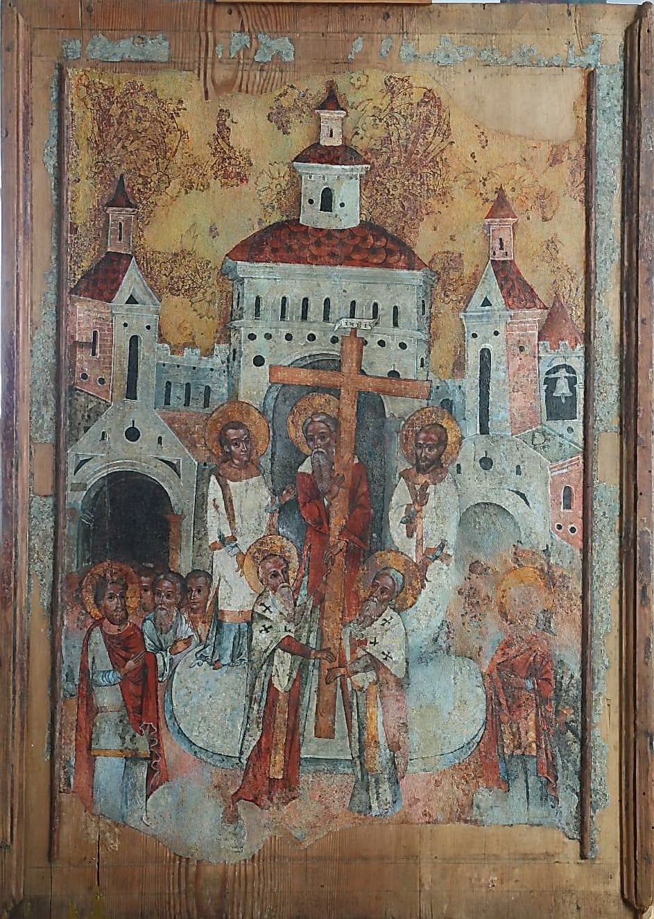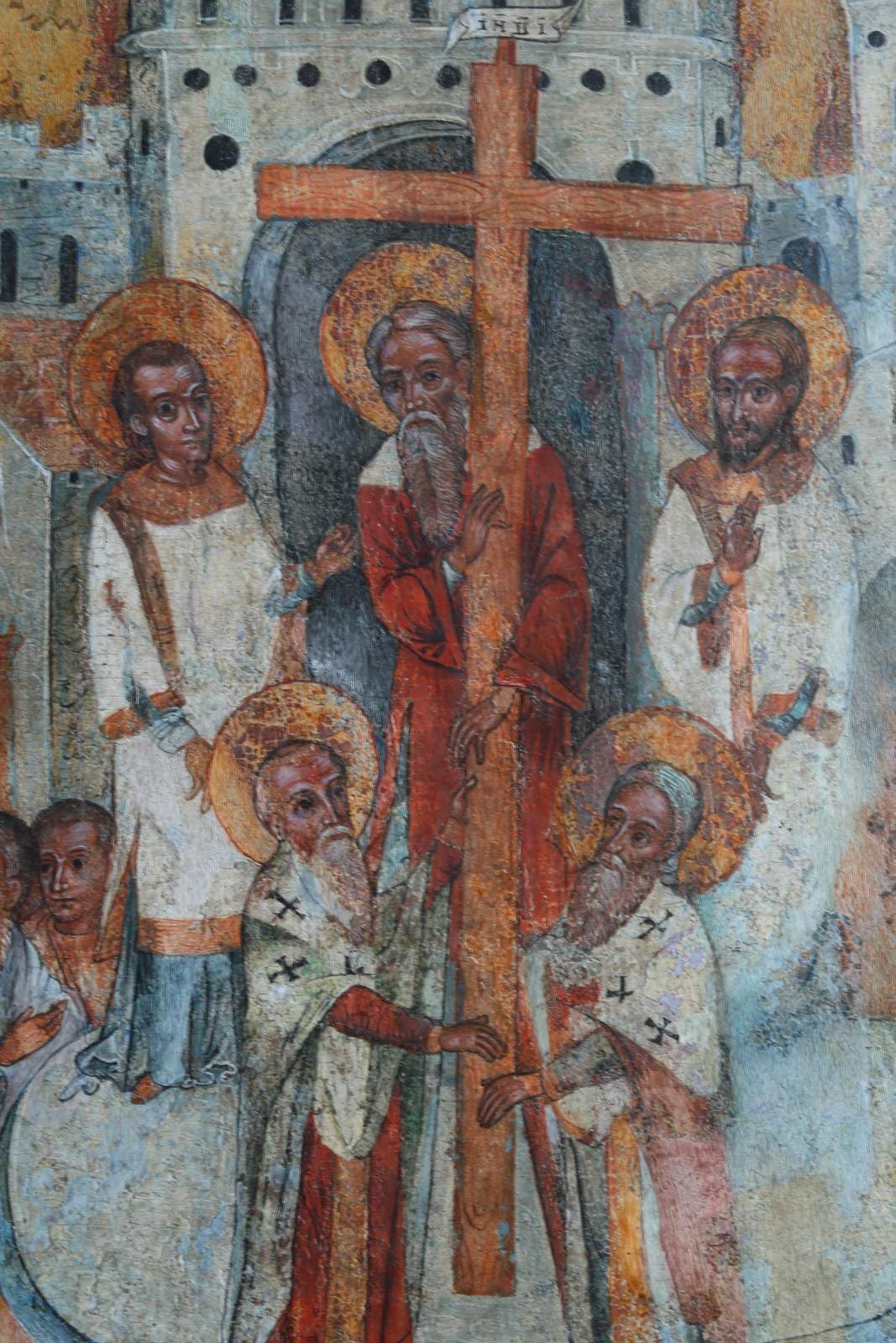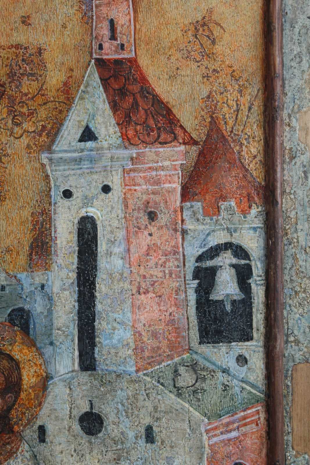 Нижня частина ікони найбільш постраждала від часу. Серед натовпу виділяється постать царя Костянтина. В іконі, як і у інших творах майстра, велика роль відводиться архітектурі. Масивні споруди з центральним храмом, двома вежами і дзвіницею з підвішеним дзвоном з’єднані високими стінами.