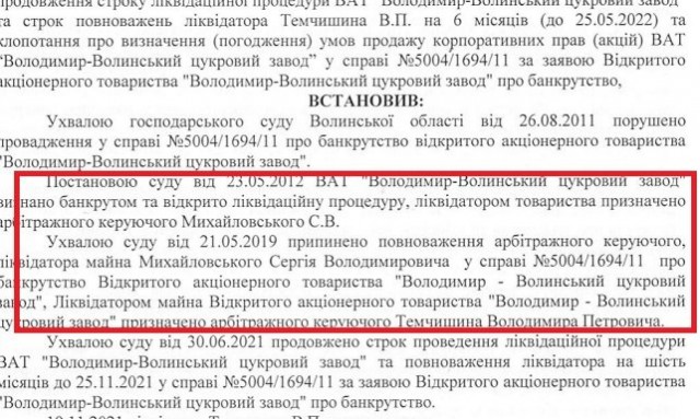 У 2011-му році було порушено справу про банкрутство Володимир-Волинського цукрового заводу. У 2021 році строк ліквідаційної процедури продовжили до травня 2022 року.
