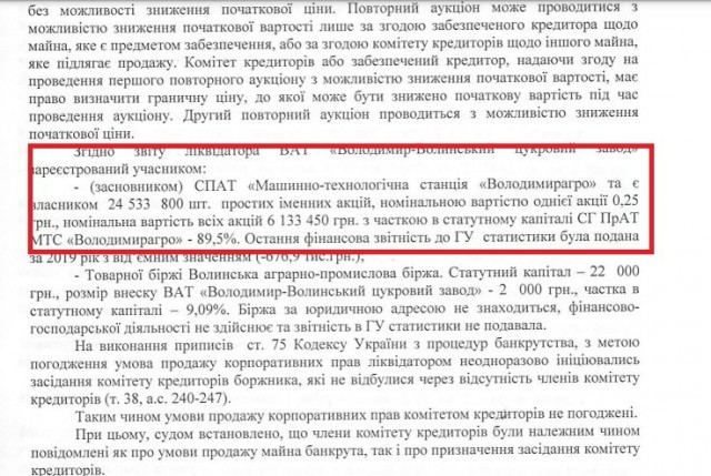 Цінні папери, які були власністю Володимир-Волинського цукрового заводу, оцінювали в шість мільйонів гривень, а продали їх за майже 37 тисяч гривень.