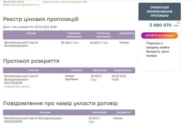 Єдиним учасником торгів став Михайловський Сергій Володимирович, який запропонував ціну у сто разів меншу, аніж стартова – 36 800,7 гривні. Саме його й визначила переможцем система.
