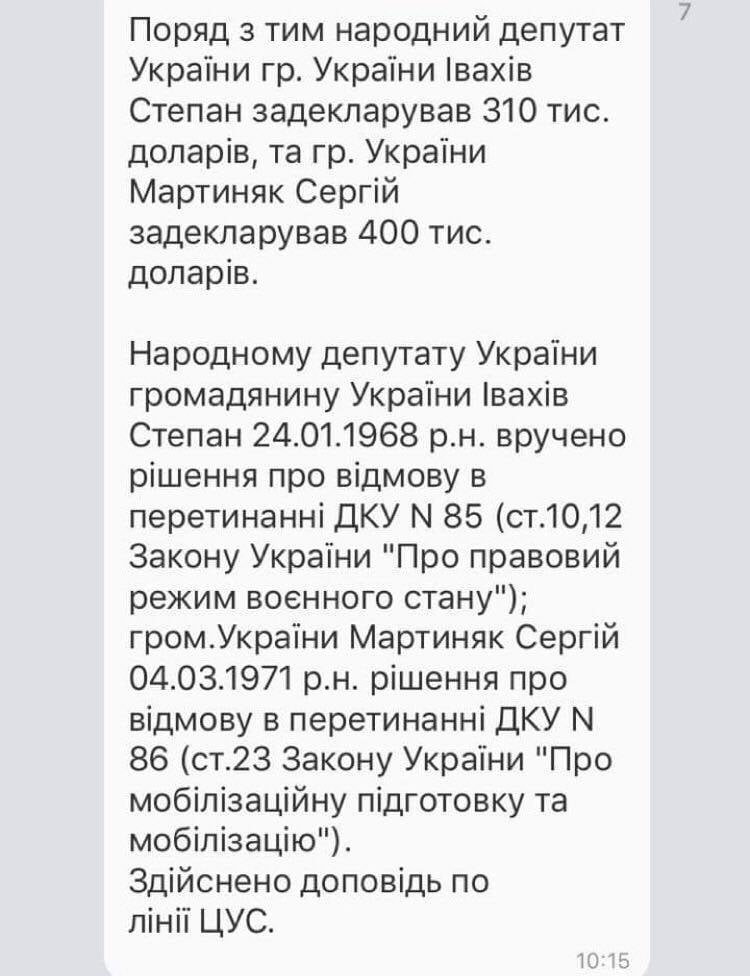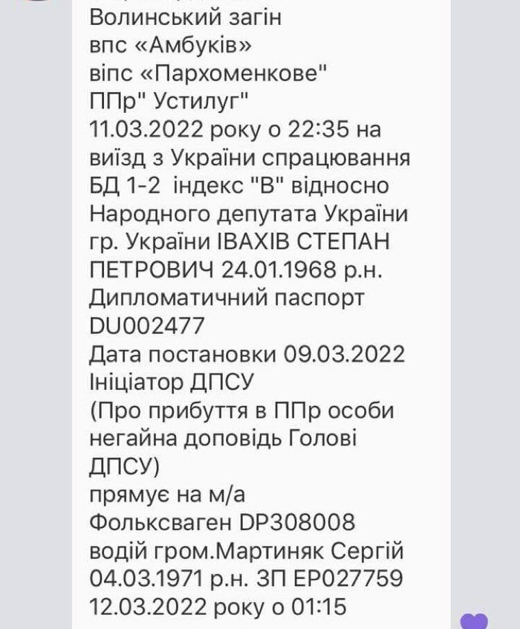 «На кінець доби 11 березня спробу виїхати за межі України зробили двоє знаних волинян. Народний депутат України Степан Івахів та екснардеп, почесний консул Литви в Луцьку Сергій Мартиняк намагалися залишити територію України через пункт пропуску «Устилуг» на автомобілі, яким кермував Мартиняк.