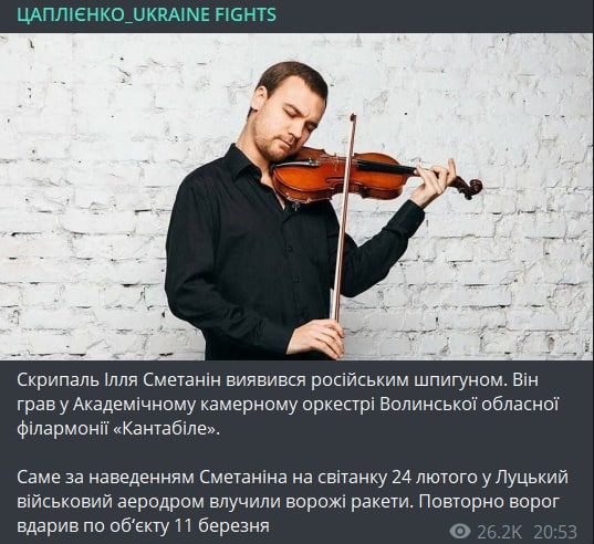 Скрипаль Ілля Сметанін виявився російським шпигуном. Він грав у Академічному камерному оркестрі Волинської обласної філармонії «Кантабіле», – йдеться в повідомленні.