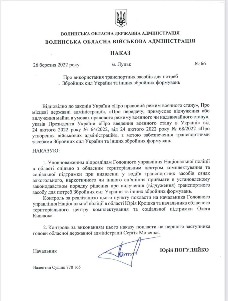 Контроль за реалізацією цього пункту поклали на начальника Головного управління Національної поліції в області Юрія Крошка та начальника обласного територіального центру комплектування та соціальної підтримки Олега Кивлюка.
